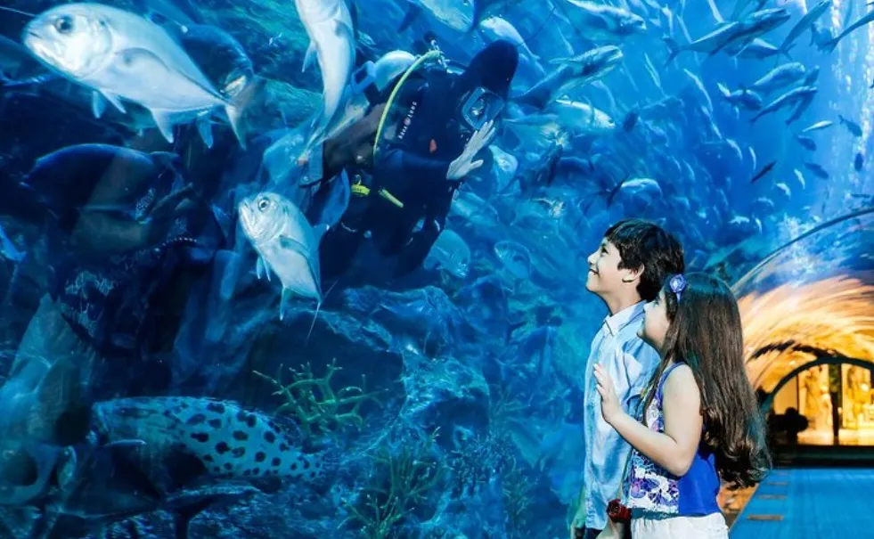 Experience the awe-inspiring Dubai Aquarium at The Mall, one of the must-visit city attractions, home to a 10-million-litre tank that holds the title of one of the largest suspended aquariums in the world. Stretching 51 meters in length, 20 meters in width, and 11 meters in height, this incredible aquarium is a must-see.